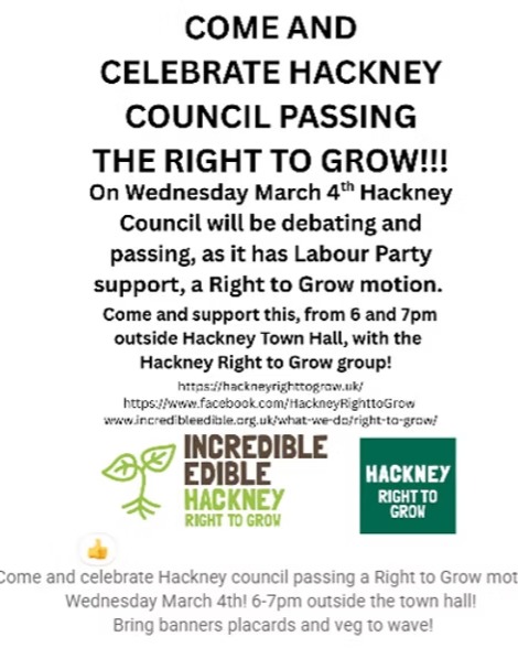 Wed 04 MarE8 1EAThe Council will be debating and passing the Right to Grow motion which has the Labour Party Support. Come and support 6-7pm outside Hackney Town Hall. https://hackneyrighttogrow.uk/